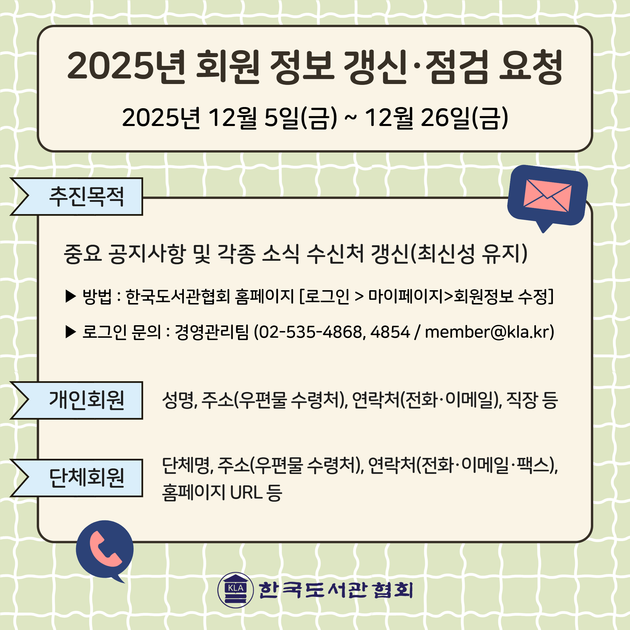 한국도서관협회는 단체 및 개인회원의 정보를 최신화하기 위해 2025년 회원정보 갱신 및 점검 기간을 운영합니다. 회원서비스 품질 향상을 위해 정기적인 회원정보 갱신에 협조를 부탁드립니다. |
