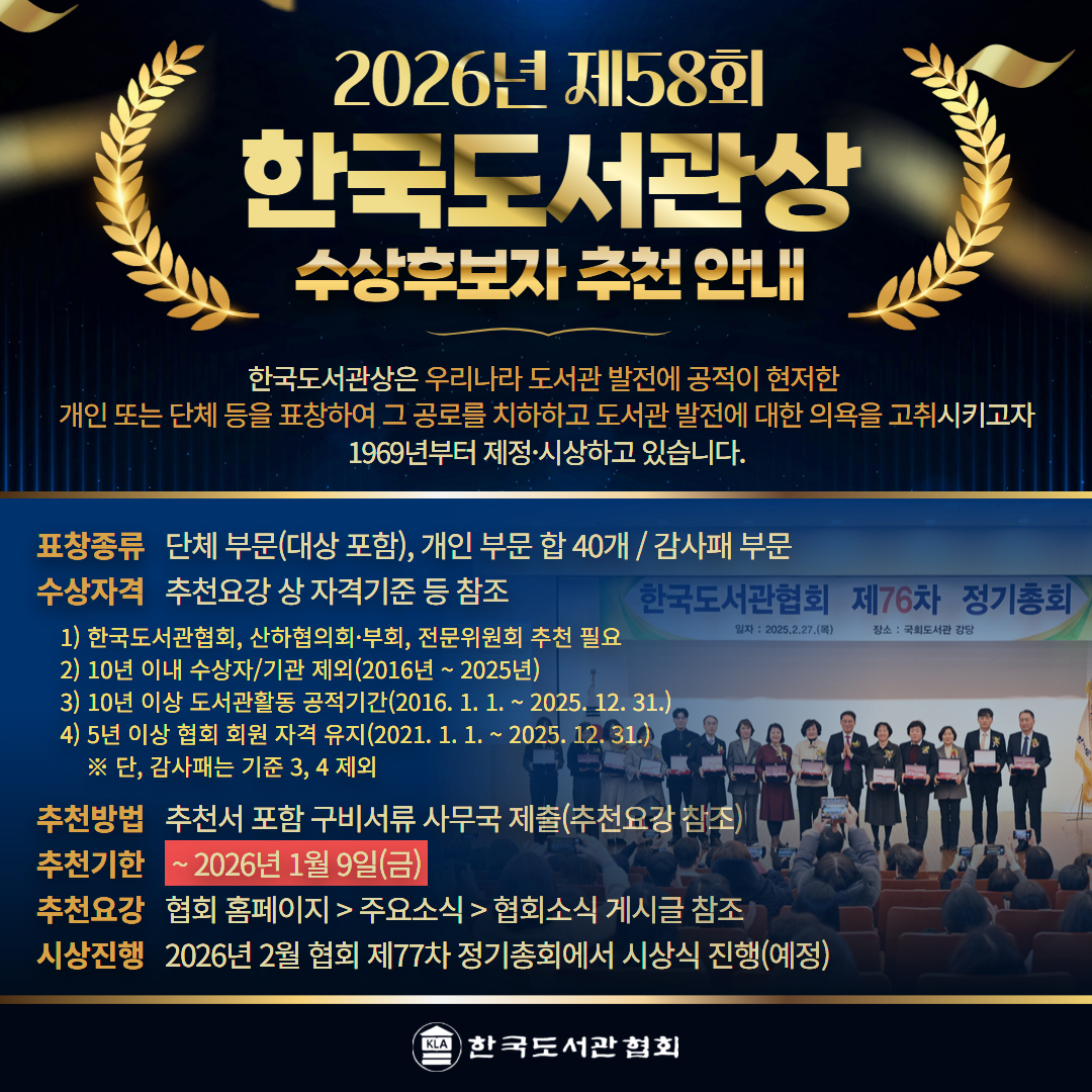 7. [모집] 제58회(2026년) 한국도서관상 수상후보자 추천 (~26/1/9)