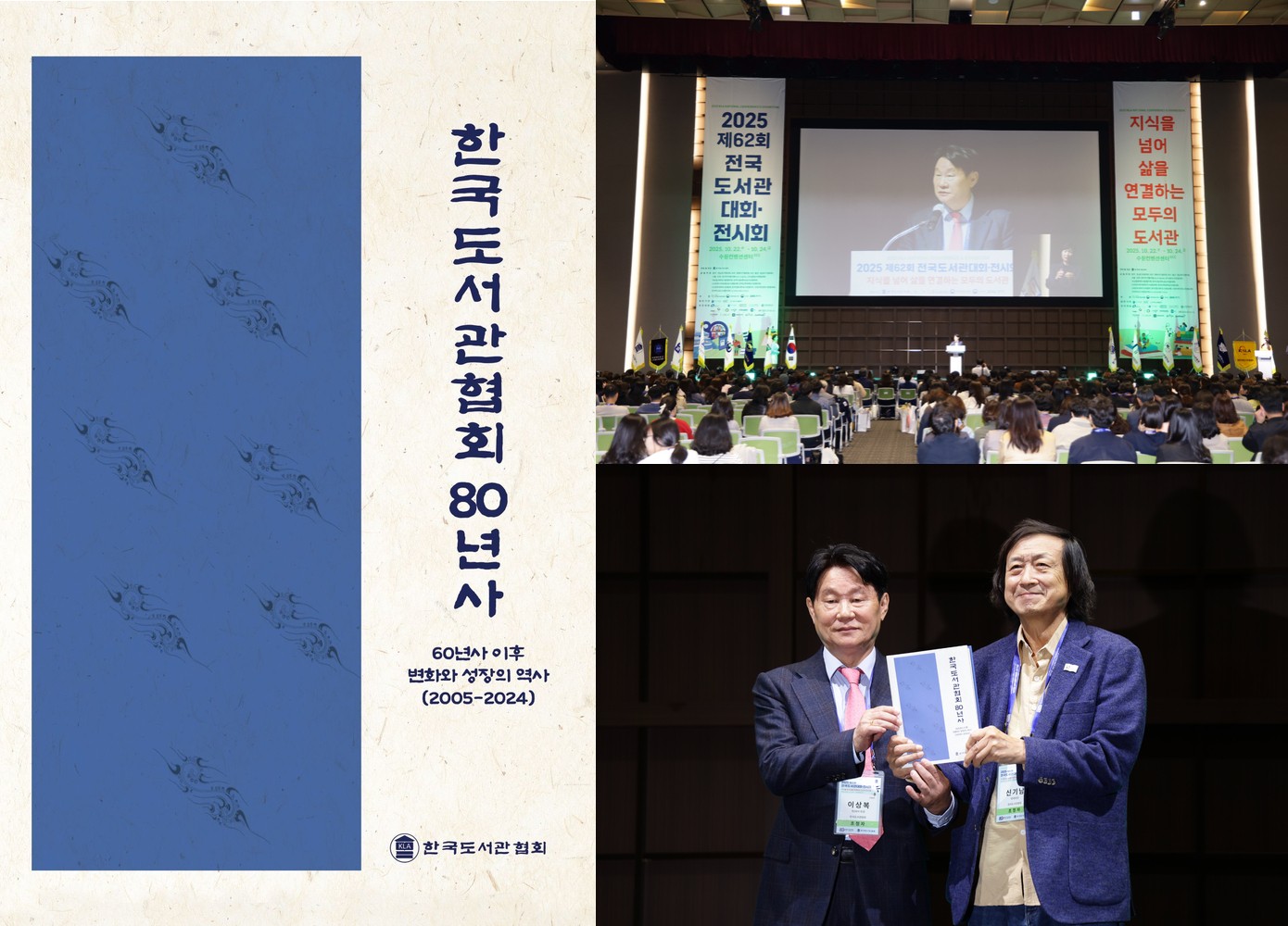 한국도서관협회는 창립 80주년을 맞아 지난 20년간의 변화와 발전을 정리한 『한국도서관협회 80년사: 60년사 이후 변화와 성장의 역사(2005-2024)』를 발간하고, 제62회 전국도서관대회·전시회 개회식에서 봉정식을 진행했습니다. |