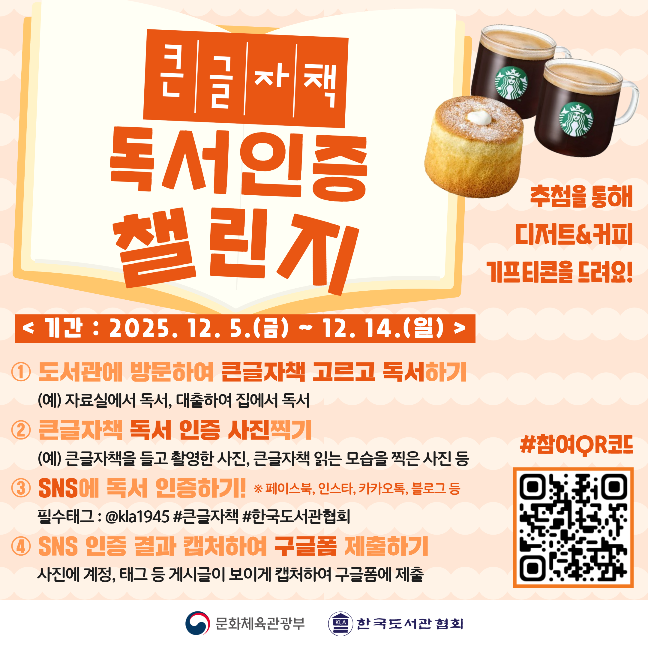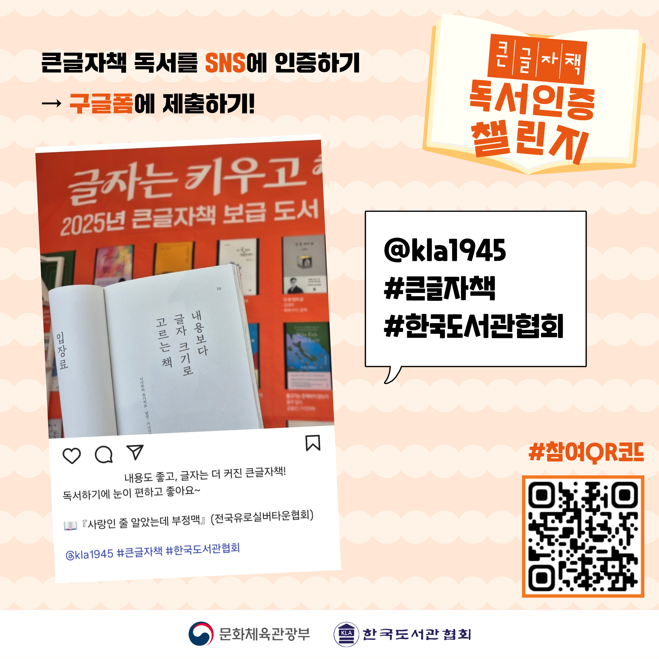한국도서관협회는 2025년 큰글자책 보급 지원 사업의 일환으로 「2025년 큰글자책 독서 인증 챌린지」를 실시합니다. 큰글자책을 읽고, 인증 사진을 구글폼으로 제출하면 누구나 참여하실 수 있습니다.